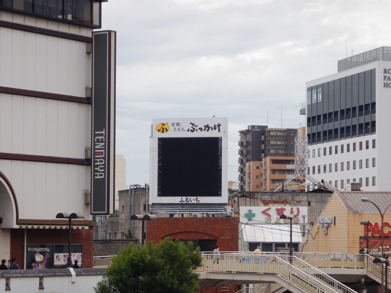 私は、電車を降りて、倉敷駅の改札を通り、南口のペデストリアンデッキに出ました。あたりを見回していると、ある看板が目に入りました。