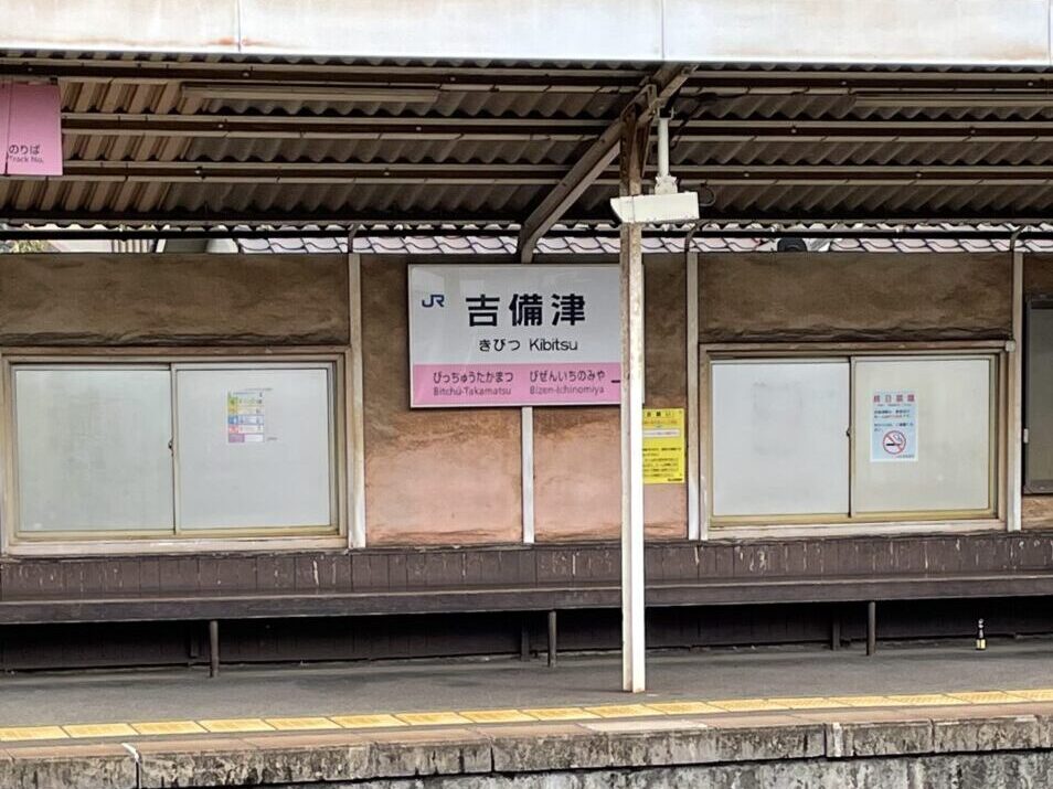 吉備津神社から歩いて、吉備津駅に着いて、時刻表を見ると10分後に列車が来る予定なので、駅のベンチで待つことにしました。